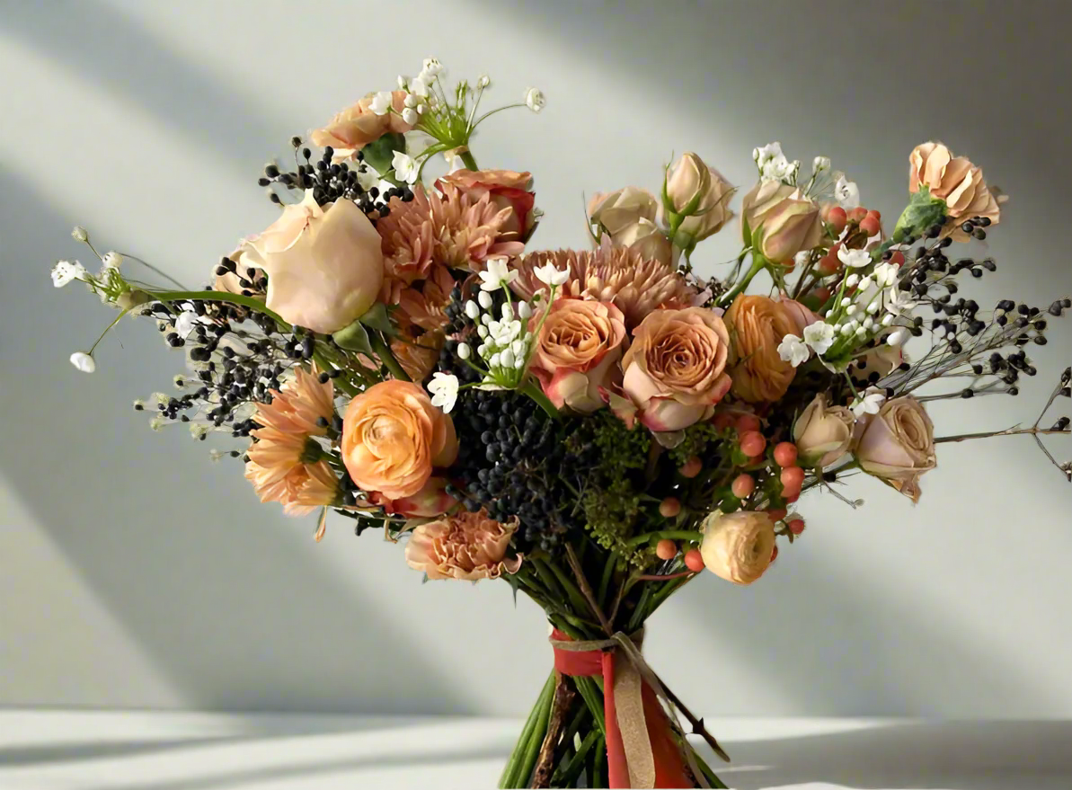 This hand tied caramel palette flower bouquet boasts a sophisticated color scheme that adds elegance and warmth to any space. With a variety of carefully selected blooms, it is expertly crafted to create a stunning focal point or thoughtful gift. Elevate any occasion with this beautiful and timeless arrangement.